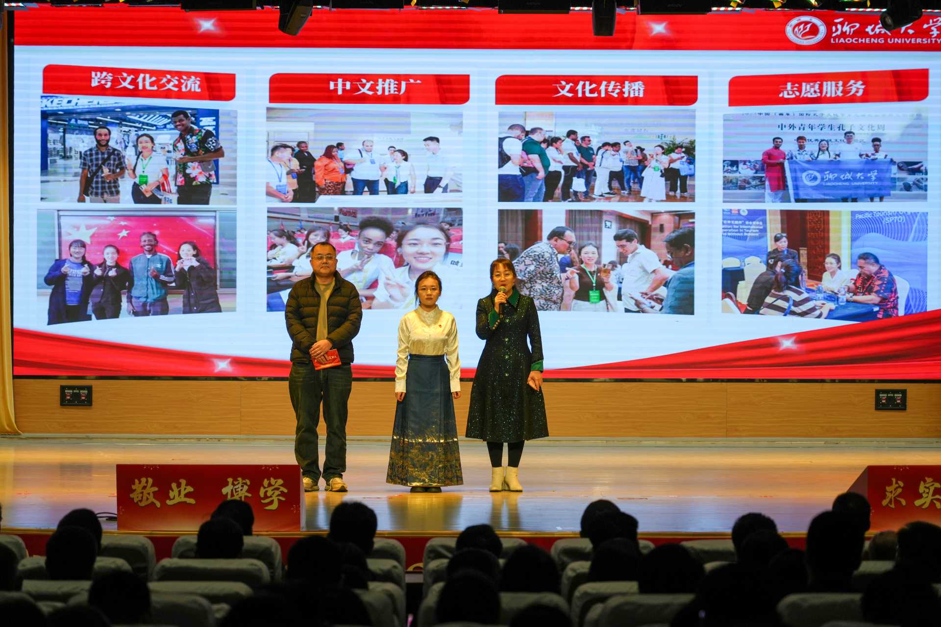 典礼在庄严的国歌声中拉开帷幕。与会师生观看专题纪录片《朝夕必争》,回顾了过去一年中聊大学子在学术科研、学科竞赛、社会实践、志愿服务等领域的精彩瞬间,展现了聊大学子锐意进取、担当作为的青春风采。典礼以“登高·致远·笃行”为脉络,精心策划《登高篇·勤学不辍》《致远篇·奋发有为》《笃行篇·守正创新》三大篇章。