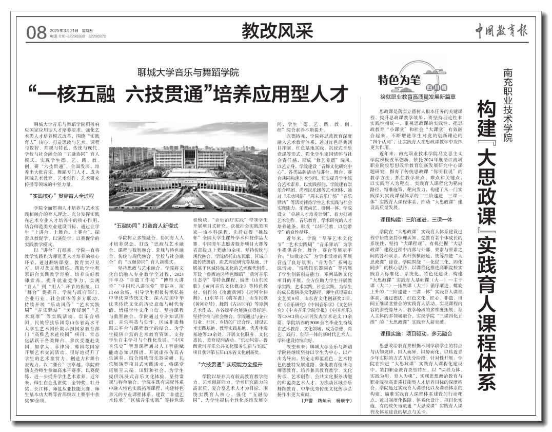 《中国教育报》报道音乐与舞蹈学院育人模式新探索与应用型人才培养先进经验