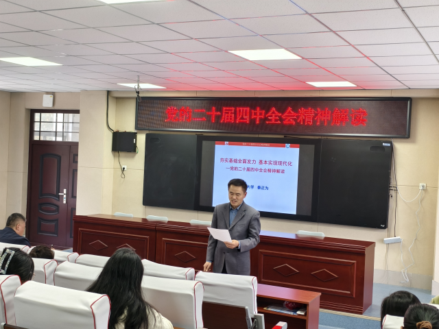 宣讲报告中,秦正为教授以《夯实基础全面发力,基本实现现代化——党的二十届四中全会精神解读》为题,紧紧围绕习近平总书记重要讲话精神和全会部署要求,系统阐释了全会的重大意义、精神实质和丰富内涵。他提到,党的二十届四中全会的召开恰逢“十四五”规划圆满收官、“十五五”规划即将开启的关键节点,会议取得的重大成果、作出的重大部署,对今后一个时期党和国家事业发展具有里程碑意义。秦教授的讲解逻辑清晰、史料翔实、论述精辟,既有理论高度,又有思想深度,整场报告会气氛热烈,学习氛围浓厚。